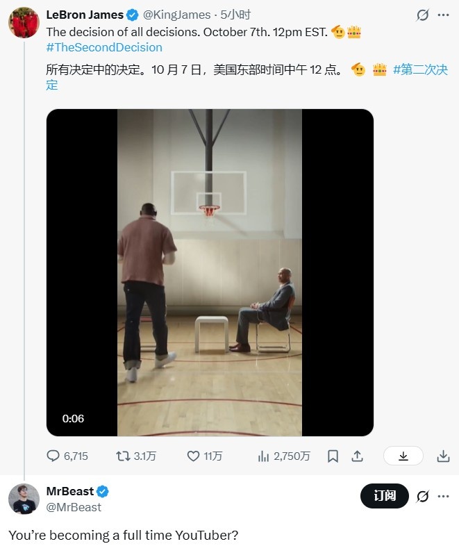 海外顶流博主野兽先生(MrBeast)在詹姆斯动态下面评论道:“你要转型当全职视频博主了吗?”