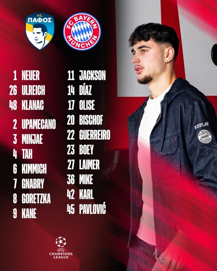 9月29日讯 北京时间10月1日凌晨3:00,欧冠联赛阶段第2轮,拜仁将客战帕福斯。今日,拜仁官方公布了本场比赛球队大名单,凯恩领衔锋线,比朔夫、博伊和格雷罗在列。