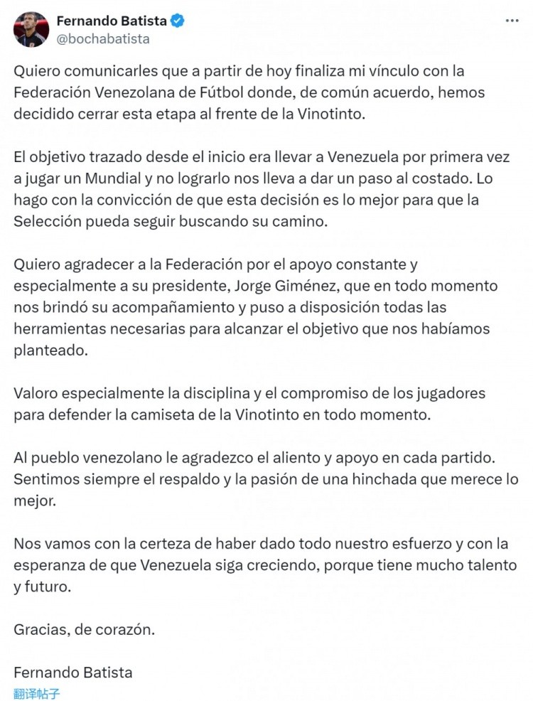 9月11日讯 委内瑞拉南美世预赛未能出线,主帅费尔南多-巴蒂斯塔离任,巴蒂斯塔社媒发文告别。